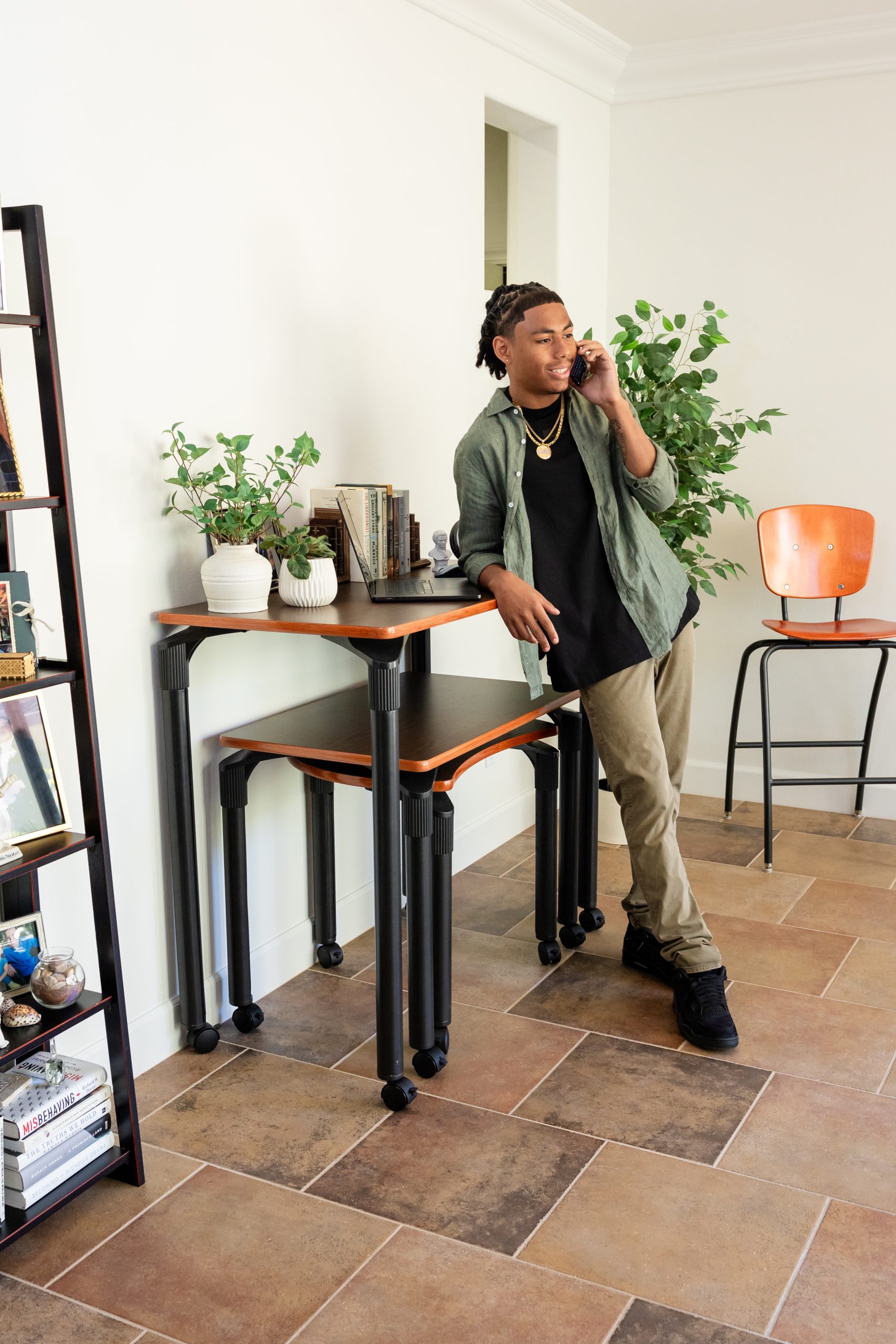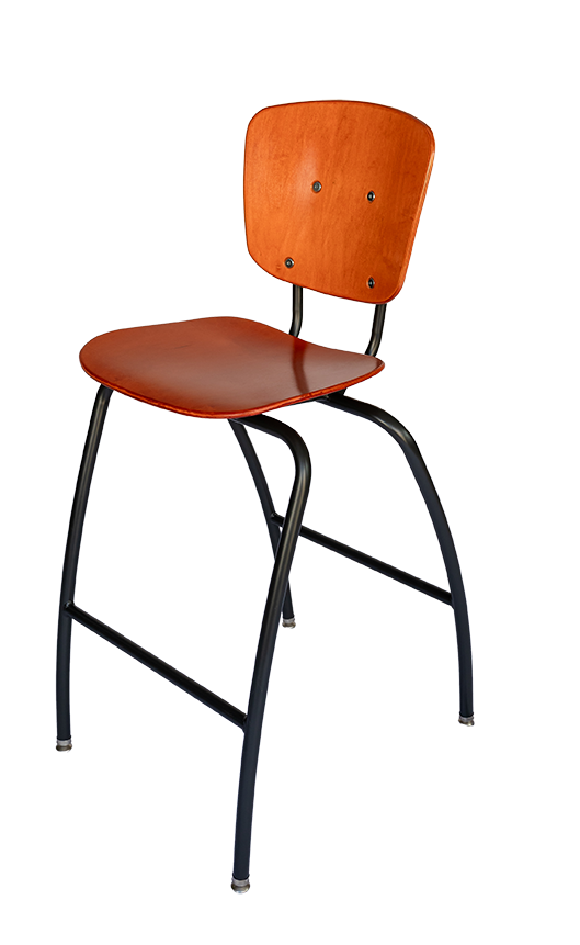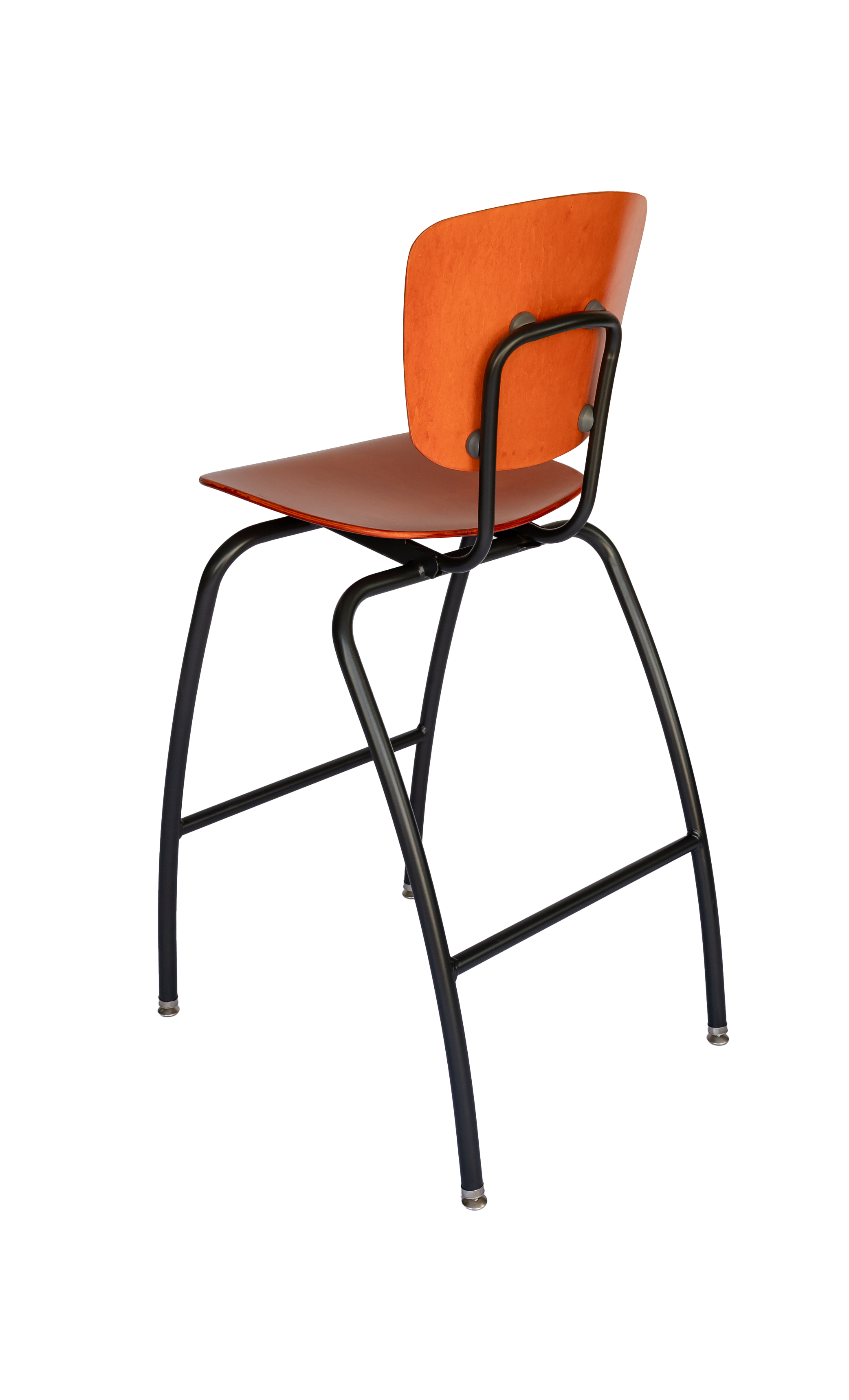 Elegant and thoughtfully ergonomic cafe’ chair combines a heavy-duty steel frame with contoured furniture grade plywood to provide the perfect high seating option. The 30 inch seat height makes this chair the perfect complement to standing height desks, bars, or tall kitchen islands. Shown in fruit punch wood stain with a black steel frame.